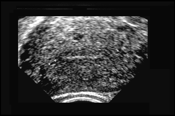 Adénomyose utérine. Coupe transversale - myomètre hyperéchogène hétérogène avec cavités de petite taille (+) - gros utérus.