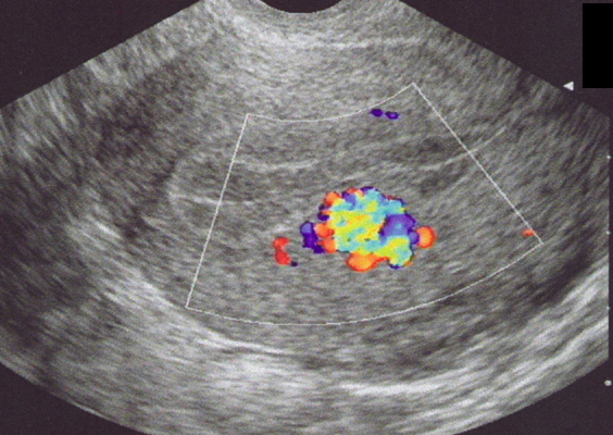 Fistule artério-veineuse au sein de l’endomètre après curetage (Doppler couleur) (Cliché : Dr. C. TALMANT)