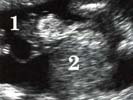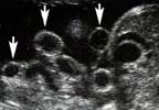 ¤ L’intestin peut flotter librement dans le liquide amniotique avec distinction nette, intestin grêle - gros intestin, anses animées de péristaltisme (bon pronostic ?) et lumière intestinale visible,