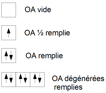 jusqu'à ce que tous les électrons soient associés à une orbitale atomique. On retrouve donc la notation des OA, sur lesquelles on spécifie le nombre d'électrons qu'elle contient en exposant.